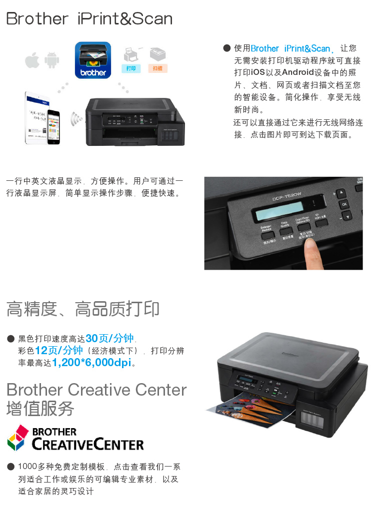 兄弟(brother)DCP-T520W彩色喷墨多功能一体机(A4幅面 内置墨仓 无线网络连接)